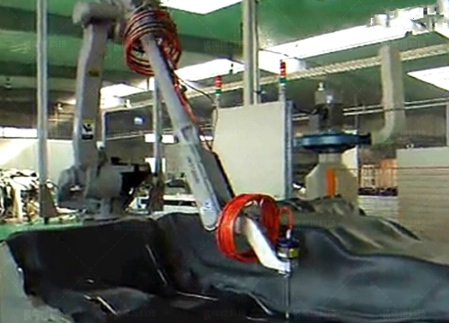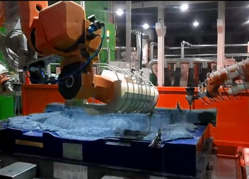 FA水切割,机器人可交替在两个工位切割作业,另一工位上下料,适合尺寸较大,精度要求高,复杂异形材料等切割加工,如车用顶棚、地毯等汽车内饰件。