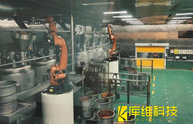 反应釜具有精准控温功能,并在不同的阶段调节不同的炉温,炒好之后,再通过管道输入包装车间。而包装环节仍然由机器人进行操作,