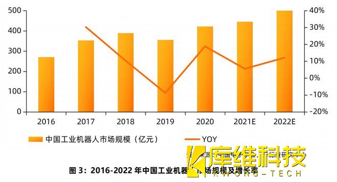 工业机器人应用市场。而据国家统计局公布的数据显示,继2020年全国工业机器人产量突破20万套大关后,2021年全国工业机器人产量成功突破30万套大关,达到36.6万套,同比增长44.9%,创历史新纪录。伴随着国内工业制造领域的生产智能化改造和数字化升级的浪潮,工业机器人将继续保持乐观的发展前景,预计2022年我国工业机器人市场规模将迫近500亿元。