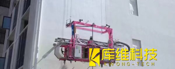 悬挂式布料机器人,这是今年刚在武汉投入使用的新型建筑机器人。它悬挂安装于住宅造楼机下方,可以实现自主作业、精准分区布料,能提高工作效率15%以上。