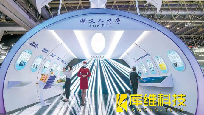 在顺义展区,模拟机舱的展台“顺义人才号”也颇为吸引眼球。走进展台,就像走入机舱,两侧是优秀项目介绍,前方大屏幕上的声光电影讲述着顺义高端制造业的故事,代入感十足。