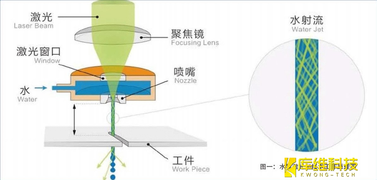 水导激光技术(Laser MicroJet, LMJ)又称激光微射流技术,其以优异的切割质量而备受瞩目。该技术通过压力调制的水腔将激光束聚焦在喷嘴上,喷出低压水柱,形成光波导,引导激光沿水流方向传播,从而实现切割。水流不仅能冷却切割区,降低材料热变形和热损伤程度,还能带走加工碎屑。相较于线锯切割,水导激光的速度显著提升。然而,由于水对不同波长的激光吸收程度不同,激光波长受限,主要为1064nm、532nm、355nm三种。