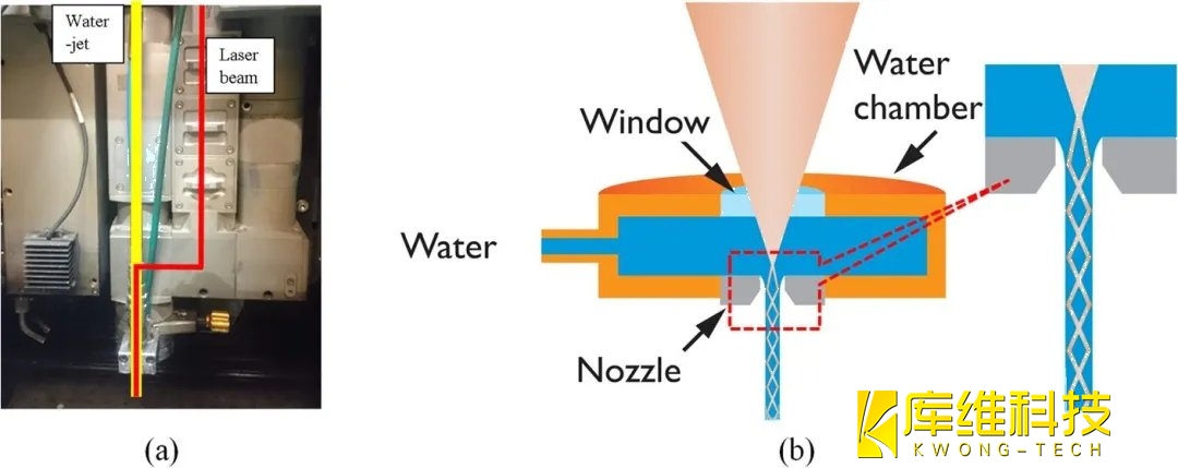 图1(a)和图1(b)分别显示了水导激光系统的照片视图和原理图,其中激光束通常为535 nm激光,聚焦在直径为40 ~ 150 μm的加压水射流上。加压的水射流作为光束导流器,通过全内反射将激光脉冲引导到激光照射区。虽然激光聚焦光斑尺寸小于水射流直径,但由于内部反射,激光束在水射流内部均匀化,在激光照射区域内,光束和射流的直径保持不变。