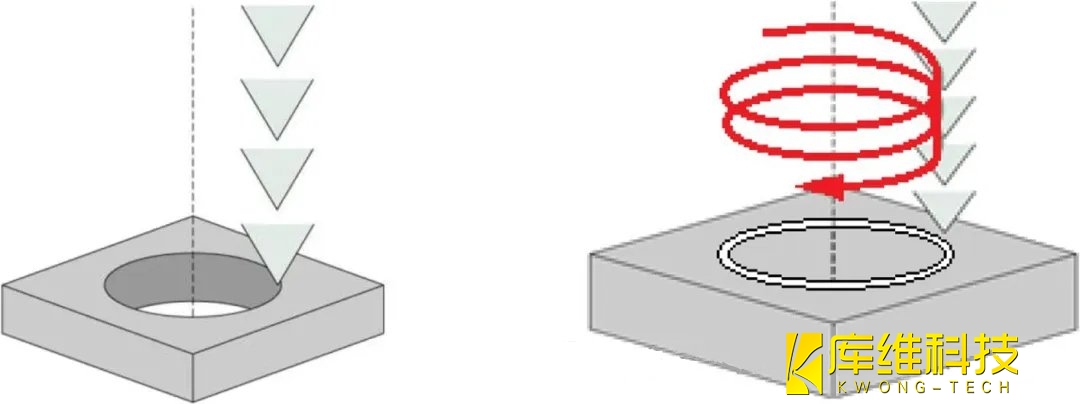 2、水导激光打孔角孔时,孔前缘仅在打孔开始时经历高温。随着钻孔向下移动(以螺旋方式),高温区域已完全包含在激光照射区域内,从而实现无分层钻孔。这与毫秒激光钻孔相反,在毫秒激光钻孔中,从钻孔过程开始到结束,在孔的前缘可以观察到有明显更高的温度。