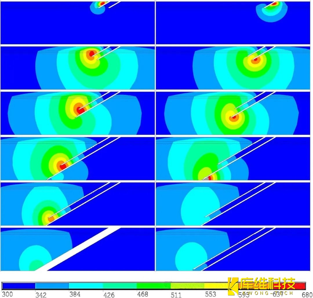 图6和图7分别显示了ms和水导激光钻孔的烧蚀曲线和温度曲线。所有结果都被绘制为与脉冲结束时间(下一个激光脉冲与材料相互作用之前)相对应的时间。图6中的视图1、视图2和视图3分别对应了初始冲击的结果:激光位于钻孔圆的右侧和激光位于钻孔圆的左侧。图6的一个主要观察结果是,在大多数情况下,在孔的顶部前缘观察到一个高温区,这应该是热障涂层分层的主要原因。