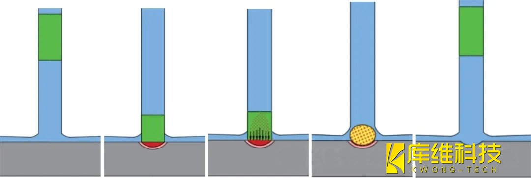 图8给出了水导激光加工过程的合理机理。首先,通过水引导(图8b)的激光脉冲(图8a)与材料表面相互作用。激光与材料的相互作用(图8b)导致辐照区内的加热、熔化(图8b)和轻微的汽化(图8c)。由于脉冲长度较长(~ 150 - 250ns),部分激光束被汽化物质吸收(图8c),导致在激光照射区上方形成等离子体(图8d)。在这个阶段,等离子体充当水射流和材料之间的中间区域(图8d)。这种现象与激光冲击强化所观察到的机制类似,在这种机制中,被困在水层和衬底之间的等离子体产生了高量级的压力波。与最先进的纳秒激光与材料的相互作用相比,等离子体产生的冲击波以及高量级的蒸汽压力加速了熔体喷射过程。一旦等离子体开始消失,水射流与高温激光照射的表面相互作用,表面可能仍然有一层薄薄的残余熔体。水射流与高温激光照射区相互作用导致水的爆炸性汽化,产生脉冲冲击压力,导致激光照射区残余熔体层被清除。因此,在水导激光钻孔上没有观察到重铸区或热影响区。