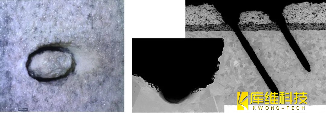 图9、水导激光在与表面45°处部分钻孔的光学显微图像
