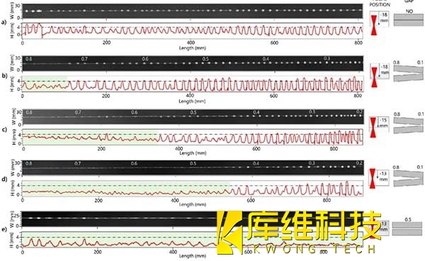 如图所示,使用轮廓仪获取的焊接底部的虚拟图像,以及沿焊接底部轴线的线轮廓。这些图像和轮廓显示了焊接底部的形态,包括是否存在驼峰,以及焊接过程中焊缝底部的宽度变化。