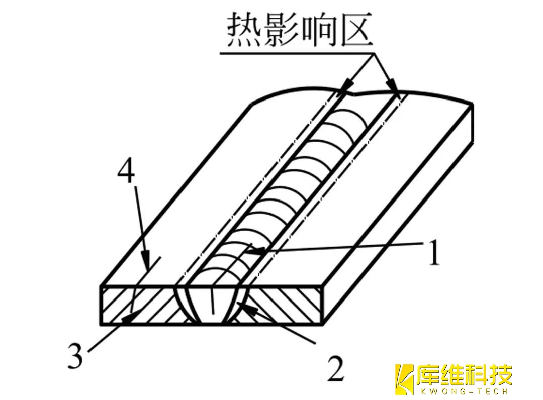 一组间断的裂纹可能存在于金属中(1)、热影响区(3)以及母材金属中(4)。