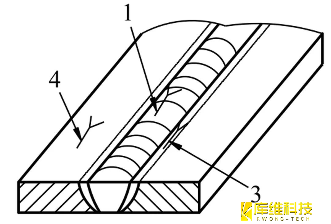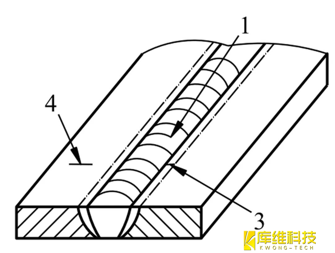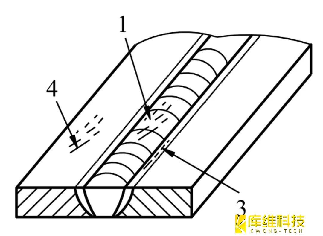 基本上与焊缝轴线平行的裂纹,可能存在于焊缝金属中(1)、熔合线上(2)、热影响区(3)以及母材金属中(4)。