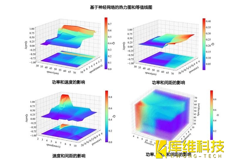 借助热力图与等值线图,能清晰锚定提升加工效果的最优参数区域:最大功率、最小间距、最大速度搭配下,加工质量趋近最佳,力求达成无环形、小壁锥度的理想成果。物理仿真模型进一步验证了机器学习模型优化结果,直观展示出激光功率、填充间距变动时,小孔烧损深度、孔壁锥度、圆环结构的变化态势。