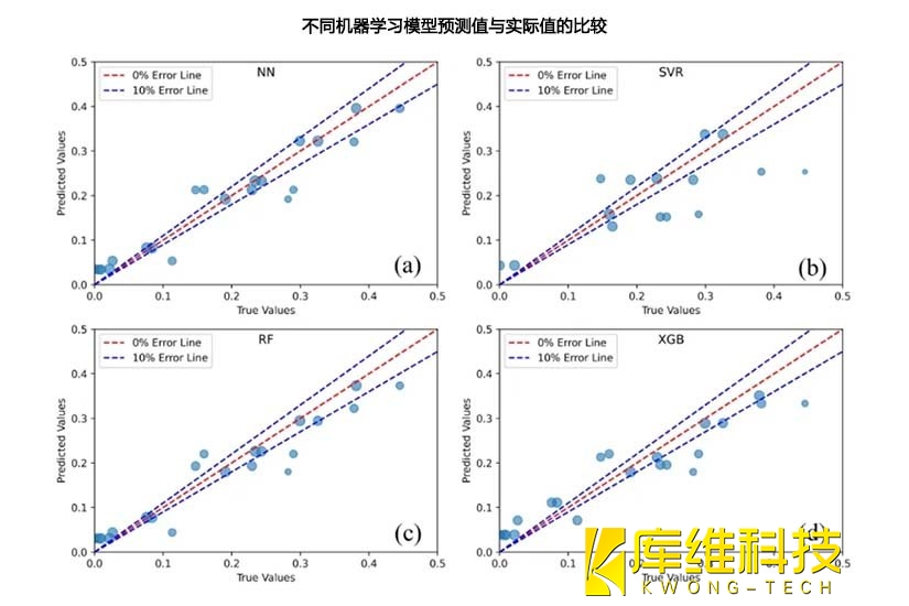 从实验流程来看,整个过程分为清晰的三个阶段,实验阶段收集原始数据;预测和优化阶段借助机器学习深挖数据关联、找寻最优参数;验证和解释阶段则利用物理仿真模型为神经网络的结果 “背书”。实验中的样本点选取也颇具讲究,24 个测试集样本点的数据直观呈现出不同机器学习技术预测值与实际值的贴合程度。