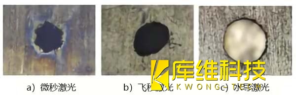 为了更明显确立水导激光打孔优势。分别用微秒激光、飞秒激光和水导激光对DD6合金进行打孔,得到的孔表面形貌对比。