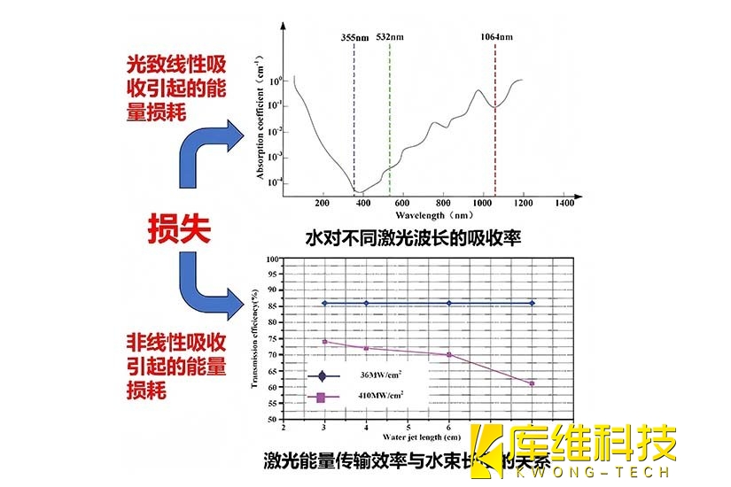 水对激光的吸收系数随波长显著变化(图1 上)。紫外波段(如 355nm)吸收系数极高,能量易被水快速吸收,导致传输损耗;红外波段(如 1064nm)吸收系数较低,能量可在水束中长距离传输。例如,1064nm 激光在水中的吸收损耗小,更适合作为水导激光的工作波长,以减少能量衰减,提升传输效率。
