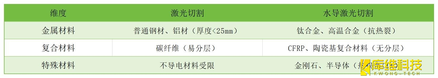 ​​激光切割对导电金属效率更高,但复合材料易产生分层;水导激光通过水流抑制热应力,可加工高硬度、热敏感材料。