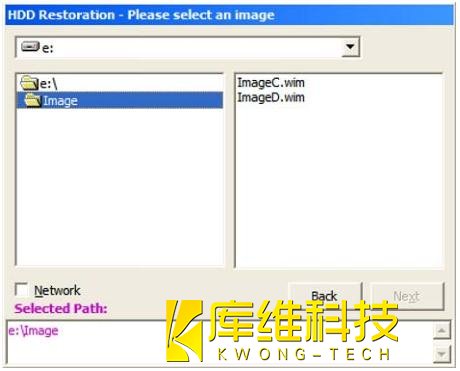 注意:只能选择单个 WIM 文件,例如为分区 C: 选择 Custom15C.WIM。当一个对应的 WIM 文件以相同名称被保存,例如为分区 C: 选择Custom15C.WIM,则将自动恢复两个分区。