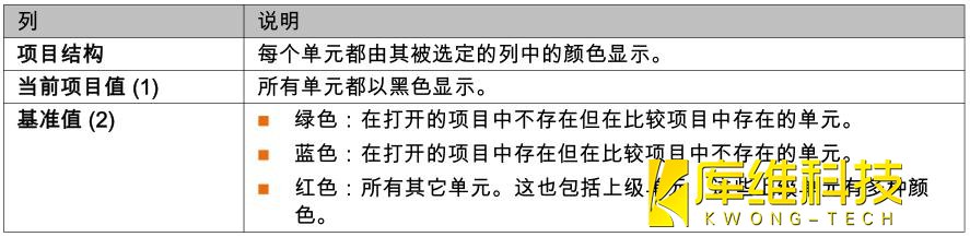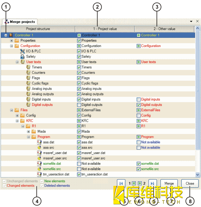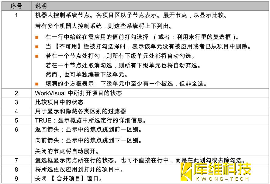 利用 【比较】功能可显示已存项目与 KR C4 里现有项目之间的差异。 为此,必须将 KR C4 在线项目与已在 WorkVisual 保存的相同项目同时打开。