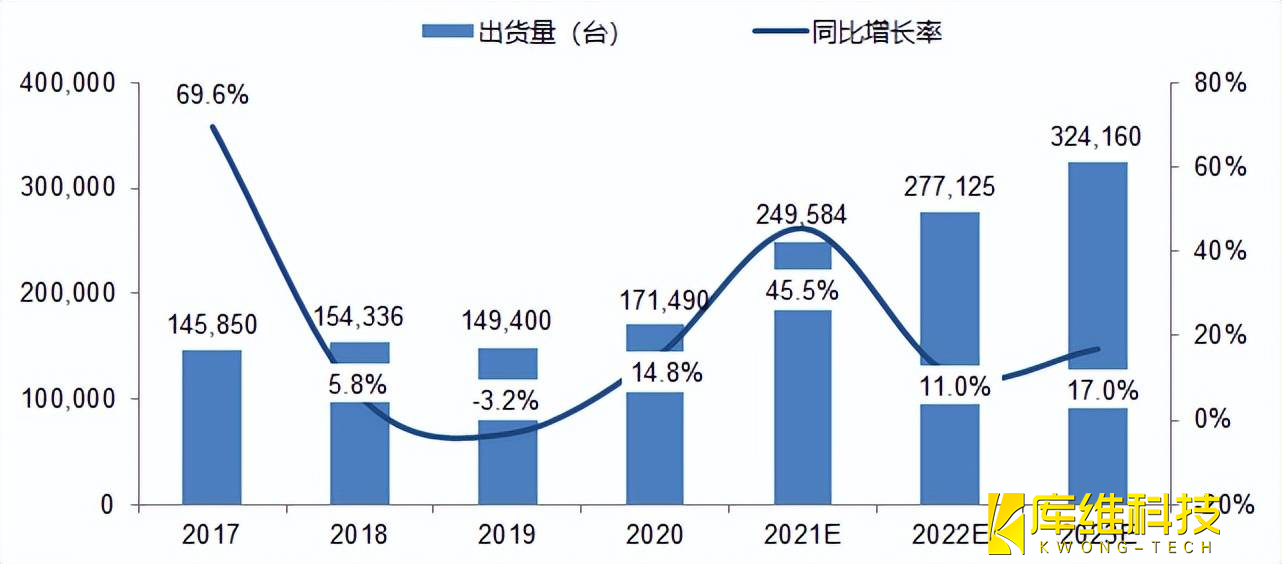 根据相关数据表明,2020年中国工业机器人市场出货量为17.15万台,同比增长14.8%,预计2021年中国工业机器人市场出货量将为24.96万台,同比增长45.5%。长远来看,中国工业机器人市场发展空间广阔,行业需求也将稳速增长,国产替代趋势不改。